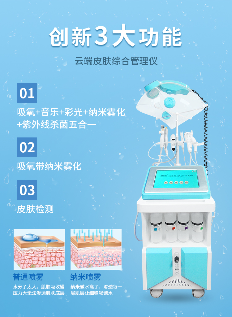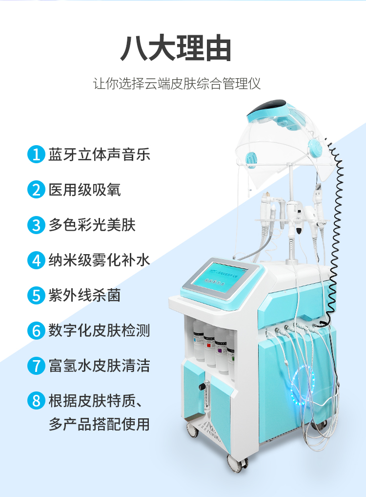 云端皮膚綜合管理儀是一款高端的美容院儀器,可開展多個項目,如皮膚智能檢測分析、美白.嫩膚、緊膚去痘、補氧注氧、營養導入等。