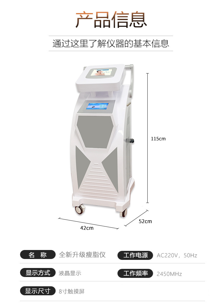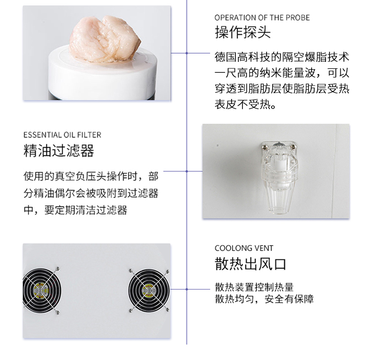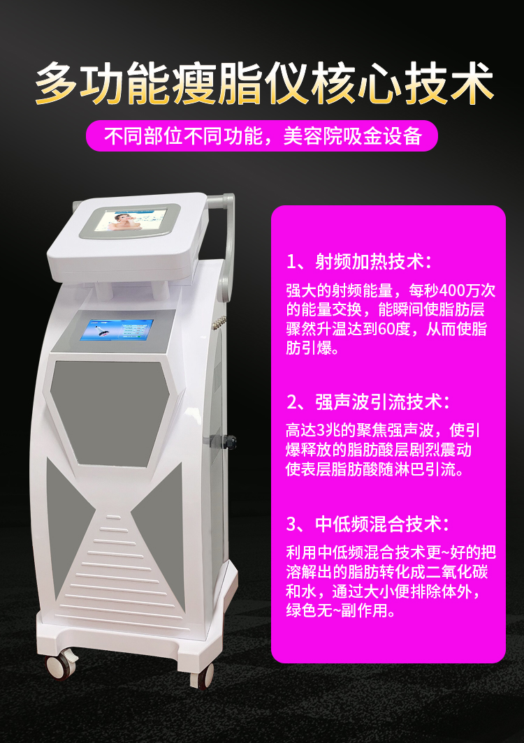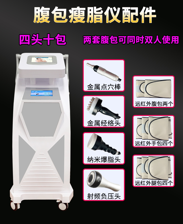 雙屏腹包隔空爆脂儀,爆脂頭電源功率高達600w,比市面上的都要高,效果更好;負壓頭采用負壓+射頻技術,塑形效果更好更持久;雙套腹包,可同時操作兩個人;顏值高,是一款高端減肥儀器。